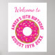 Cartaz de poster de boas-vindas do tema da Festa de aniversário de donut. Modelo colorido divertido com desenho de rosquinha borrifado. Design alegre para a celebração infantil.