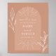 Arte botânica simples com roteiro, nomes de casais e data de casamento sobre fundo de terracota com arco.