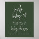 Este moderno sinal de boas-vindas do chá de fraldas apresenta uma fonte escura e escrita à mão com uma combinação de cor verde e branca da floresta. Seu design é o sinal perfeito para a mãe moderna.