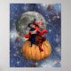 Uma doce imagem de vintage de uma garota vestida como uma bruxa fofa abraçando seu gato em uma abóbora enorme com a lua de cheio atrás de um belo fundo do espaço estrelado faz arte de excelente para sua decoração natal de Halloween.