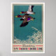 Poster de viagens vintage de restaurada e digitalmente aprimorada mostrando malardas voando. Imperfeições removidas. Cores corrigidas.