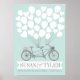 Este poster de 20 x 28 pol personalizável é uma forma alternativo única de fazer com que os convidados deixem uma mensagem pessoal no seu dia especial em vez do tradicional guia de hóspedes. Balões brancos, em forma oval e cardíaca, flutuam acima de uma ilustração fofinha de uma bicicleta construída para dois. Dois corações românticos cor-de-rosa descansam no banco de trás da bicicleta. Os balões têm um tamanho de cerca de 2" a 3", com espaço para 32 convidados assinarem seus nomes, iniciais ou deixar uma pequena mensagem. O plano de fundo mostrado é uma cor aqua moderna e suave, mas pode ser alterado para QUALQUER COR que você queira corresponder ao seu esquema de cor do evento, simplesmente clique no botão ‘Personalizar o evento’ e escolha uma Cor de fundo impressa diferente no seletor fornecido. Todo texto também é personalizável, basta usar os modelos fáceis e depois ajustar a posição e os tamanhos de fonte com a opção ‘Personalizar Ti’. Quando terminar, você terá uma bela trabalho de arte moderna que você pode enquadrar e segurar como uma lembrança por anos! Por favor, procure na minha loja outros designs de poster do livro de convidados. com