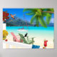 Poster de cena de praia tropical. Cena de praia com casa de praia e praia de varanda com flores, gato, cadeira de balanço, cadeiras de praia, palmeiras, veleiro e beija-flor.