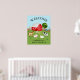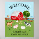 Poster de boas-vindas com animais de criação bonitos e um celeiro vermelho.