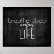 Esta poster de citação inspiradora tem texto branco tipográfico com respiração profunda desfrute da vida em cinzas de carvão escuro como fundo aflita para decoração de arte em parede em casa ou no escritório.