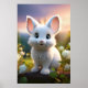 Poster de um coelho branco giro com olhos azuis grandes e pelúcia lisa em meio a flores brancas e folhagem verde, com um pôr do sol macio ao fundo. A cena evoca um senso de calor e serenidade.