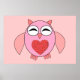 Esta poster apresenta um desenho fofo de uma coruja rosa com olhos sonolentos, um pequeno bico e pequenos pés fofos. A coruja tem um grande coração de amor vermelho no meio da barriga e asas bem abertas prontas para dar um grande abraço a alguém.
