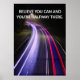 Acredite que pode e está a meio caminho. Citações inspiracionais ou declarações motivacionais de negócios são um líder perfeito em sucesso, produtividade e disciplina se você tem paixão e a mentalidade certa no ginásio. Fotografia de uma rua urbana com trilhas de luz à noite.