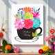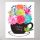 Café Tea Cup Art Poster Wall Art com flores coloridas rosa, vermelha, verde, laranja, roxa, verde, aquarela. Você pode mudar o texto na xícara negra usando a opção personalizar esta modelo. Faz uma maravilhosa adição à cozinha, sala de jantar, sala de estar, varanda ou qualquer outro espaço na sua decoração.