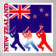 Três jogadores de críquete Silhouetted em frente à bandeira da Nova Zelândia com o nome de país Nova Zelândia ao lado.