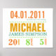 Preencha todos os detalhes da data de nascimento para qualquer criança (velha ou jovem) criar este poster especial cheio de memória. Excelente para decorar um berçário ou para mostrar os detalhes de todos os membros da sua família numa colagem de posters na sala de uma família. Data de Nascimento Hora do Primeiro Nome Próximo do Dia Libras de Comprimento Médio e Sobrenome Querem este poster maior ou menor que 14" x 11"? Sem problemas, basta escolher "Personalizar" para alterar o tamanho, as cores e o layout para ajustado das estatísticas.