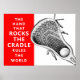 Poster de lacrosse criativa, com arte de lax stick e citação motivacional.