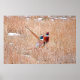Este Poster de Pheasant de pescoço-anel apresenta dois faisões de pescoço-anel do estado de Montana. O faisão do pescoço do Anel, mais adaptado ao país aberto, foi introduzido como uma ave-caça em várias partes do mundo, incluindo a América do Norte. Aqui ele prospera em algumas áreas, como as pradarias nortes, onde as cores iridescentes e os ricos apelos aos machos acrescentam muito à paisagem. Os bandos de inverno destes faisões são frequentemente segregados — pequenos grupos de machos, bandos maiores de fêmeas.