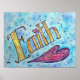 A palavra "Fé" é pintada num ouro amarelo mole contra fundo azul macio aplicado. Um grande coração rosa e roxo sublinha e suporta o texto de "Fé". O grande coração é reforçado pelo pequeno coração cor-de-rosa pontando o "i" em "Fé". A pintura a aquarela tem um contraste textural e brilho de uma camada de luz de brilho. As séries inspiracionais de pintura de palavras são tiradas do texto usado nas pinturas de anjo. "Eu escolho dar as boas-vindas à fé." - Minha Vida, Minha Escolha "Na minha vida, eu escolho manter minha fé" - Sentir Beleza "Não pode corroer a fé" - Que Cancer não pode fazer Estas imagens são desenhadas de forma a proporcionar reflexão e meditação em uma palavra solteiro. Você também pode combiná-los para fazer sua própria série de palavras para meditação/ contemplação.