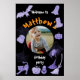 Poster de boas-vindas com Festa de aniversário de roxa e preta com motivos ilustrados para o Halloween. No centro você pode personalizar o poster com o favorito do seu bebê e pode modificar todo o texto que aparece. Na parte de trás, uma impressão com fantasmas engraçados voando. (Foto cortesia de Alvin Mahmudov da Unsplash.)