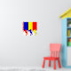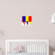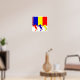 Três jogadores de futebol jogam em frente à bandeira romena. Nome do país A Romênia está do lado