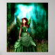Esta bela fada está vestindo um longo vestido verde. Ela está em um desmatamento.