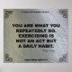 Esta malhação motivacional em aço e preto apresenta uma citação malhação do autor motivacional e designer Felicity Luckey. Este poster de ginástica é parte de uma série de 52 posters motivacionais para inspiração de exercícios e motivação para exercícios. A citação do exercício diz: VOCÊ É O QUE VOCÊ REPETIDAMENTE FAZ. O EXERCÍCIO NÃO É UM ATO, MAS UM HÁBITO DIÁRIO.
