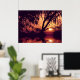 pôr do sol laranja profundo com a silhueta natural de goma-lenha e folhas australianas - reflexão solar sobre a água ondulante