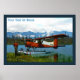 Um piloto de arbusto fica perto do seu flutuador de Havilland Canada DHC-2 Beaver na costa de um lago no extremo norte; montanhas e árvores estão à distância. Personalize adicionando seu próprio texto. Esta imagem foi derivada, em parte, de uma foto do Serviço de Pesca e Vida Selvagem dos EUA.