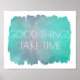 Esta inspiracional poster de arte tem coisas boas que levam tempo citando textos brancos motivacionais em tons de cor d'água de pinceladas de tinta azul, lacre e turquesa para decoração em casa ou no escritório. Direitos autorais originais Ann Powell todos os direitos reservados.