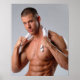 Poster de foto de quatro cores do especialista em malhações Justin Woltering com toalha ao redor do pescoço.