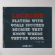 Um poster de lacrosse motivacional, sobre o denim azul rasgado, com letras vermelhas e brancas. (Este inspiracional impressão de lacrosse faz parte de uma série de 10 posters com citações de lacrosse neste design de denim.) A citação de lacrosse nesta poster de esportes lê: "Jogadores de Lacrosse com metas bem sucedidas porque sabem para onde estão indo." ~ Felicity Luckey