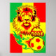 Um leão com pata em uma bola de futebol flamejante nas tradicionais cores africanas do VERDE, AMARELO e VERMELHO.