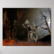 Uma mulher de madeira, solitária e sabedora da floresta, levantou vassoura na mão, acompanhada de uma coruja-de-vidro e um gato zangado — fotografados juntos no mesmo pedaço de madeira de cedro de montanha com agentes intempéries — correu em direção a um incêndio latente tarde demais para salvar sua vítima, mas ainda esperando parar sua propagação. Números de inquisidores/juízes erguem-se como fantasmas dos montes contra uma lua de cheio com um anel vermelho sullen.