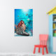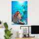 uma sereia mágica se senta no fundo do mar e olha ansiosamente ao nível do mar - natação de peixe prateado ao seu redor