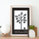 Árvore estilizada branca preta sobre poster de impressão motivacional de fundo branco, exibindo uma árvore com folhas e fruta em estilo mínimo preto e branco. O machado diz: "LIMPE UMA ÁRVORE, VOCÊ FICA MAIS PRÓXIMO DO CÉU".