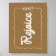 Poster de férias minimalista com a inscrição "Rejoice" em branco sobre fundo neutro, enquadrado com um simples arco. Uma peça limpa e moderna de decoração do muro de Natal celebrando a temporada.