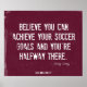 Este poster de futebol motivacional apresenta uma citação de futebol inspiradora sobre o sucesso rasgado por malhação de denim. A citação motivacional do futebol para jogadores de futebol, treinadores e motivação em equipe do autor e designer Felicity Luckey diz: "Acredite que você pode alcançar seus objetivos de futebol e você está no meio do caminho." ~ Felicity Luckey.