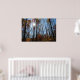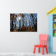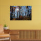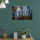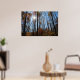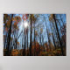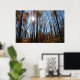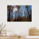 Esta poster apresenta o sol brilhando através de árvores altas do outono. Folhas coloridas, céu azul.