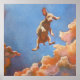 Poster quadrado com uma pintura de um filhote voando num céu azul com nuvens. Este é um presente para fazer alguém sorrir. Excelente para o quarto de uma criança ou sala de espera médica.