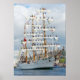 A parada de vela do magnífico navio à vela, à cheio, Cuauhtémoc, do México, enquanto entra no porto de Bergen durante a Corrida de Naves Altas é capturada nesta fotografia.