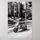 Este é um poster vintage clássico de um patinete italiano Vintage com um sinal de One Way no fundo, um patinete preto e branco clássico, um design retrô italiano.
