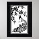 Poster de pavão branco preto e flores de cereja
