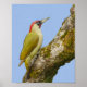 Poster com foto de pica-pau verde no porta-malas da macieira. Fundo azul claro.