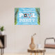 Nossa poster de piscina de de é perfeita para seu próximo aniversário ou comemoração familiar. Ele oferece um espaço útil para carregar sua própria foto e uma mensagem curta. Duas palmeiras tropicais penduram sobre uma piscina de natação no pátio de trás. É parte de um conjunto de decorações de festas que combinam temas em torno da sua piscina favorita e vibrações de verão.