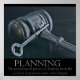 Chave de gavel e esqueleto do juiz de madeira com a palavra "Planejamento" e é definição.