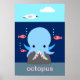 Polvo azul-bonito com três peixes laranja e uma gaivota sobrevoando. Diz "polvo", mas pode mudar a redação.