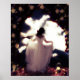 A noiva observando com a pomba a lâmpada rodeada de flores