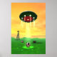 Uma ilustração cômica de uma vaca sendo sequestrada por um disco voador