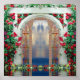 Belas rosas vermelhas que formam uma janela mágica aberta no mar.. Jardim entoado é lugar de fantasia onde relaxar nossa mente...