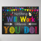 NADA FUNCIONARÁ A MENOS QUE VOCÊ FUNCIONE! Um poster excelente para frequentar uma sala de aula, um escritório de orientação escolar, escritório de assistentes sociais, terapeuta infantil ou escritório de psicólogos infantis como um lembrete que eles precisam colocar no trabalho para obter os resultados desejados! Um poster inspiracional e motivacional excelente. Um poster muito brilhante, divertido e alegre para decorar a sala de aula, o escritório da assistente social, o escritório terapeuta, o escritório principal ou o escritório de aconselhamento. Cores brilhantes e atraentes em um fundo de quadro negro.