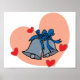 Uma design de alguns sinos de casamento colocou dentro em fundo cor-de-rosa. Os sinos de casamento estão lado a lado e há também alguns corações vermelhos à sua volta. Este design de sinos de casamento parece excelente nesta Poster