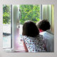Garoto e garota olhando pela janela na chuva de verão