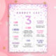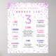 Celebre o marco com o terceiro aniversário de sua filha com este poster de confete colorido arco-íris com rosa e roxo, lilás e lavandas, apresentando os livros favoritos de seu filho, comidas, brinquedos, altura, peso, amores e muito mais, você certamente apreciará este poster por anos a mais. Fácil de editar e seria fantástico para a sua festa!