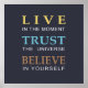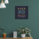 Um elegante e moderno design de tipografia com fundo azul escuro e texto amarelo, azul e marrom, com uma mensagem para lembrar de viver no momento e confiar que tudo vai ficar bem. Este presente pareceria excelente em qualquer casa ou escritório.